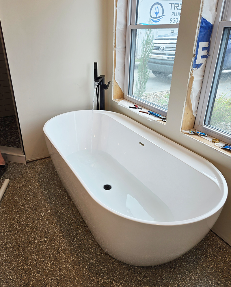 Trident recently installed and plumbed this beautiful standalone tub and unique waterfall faucet for a recent project.