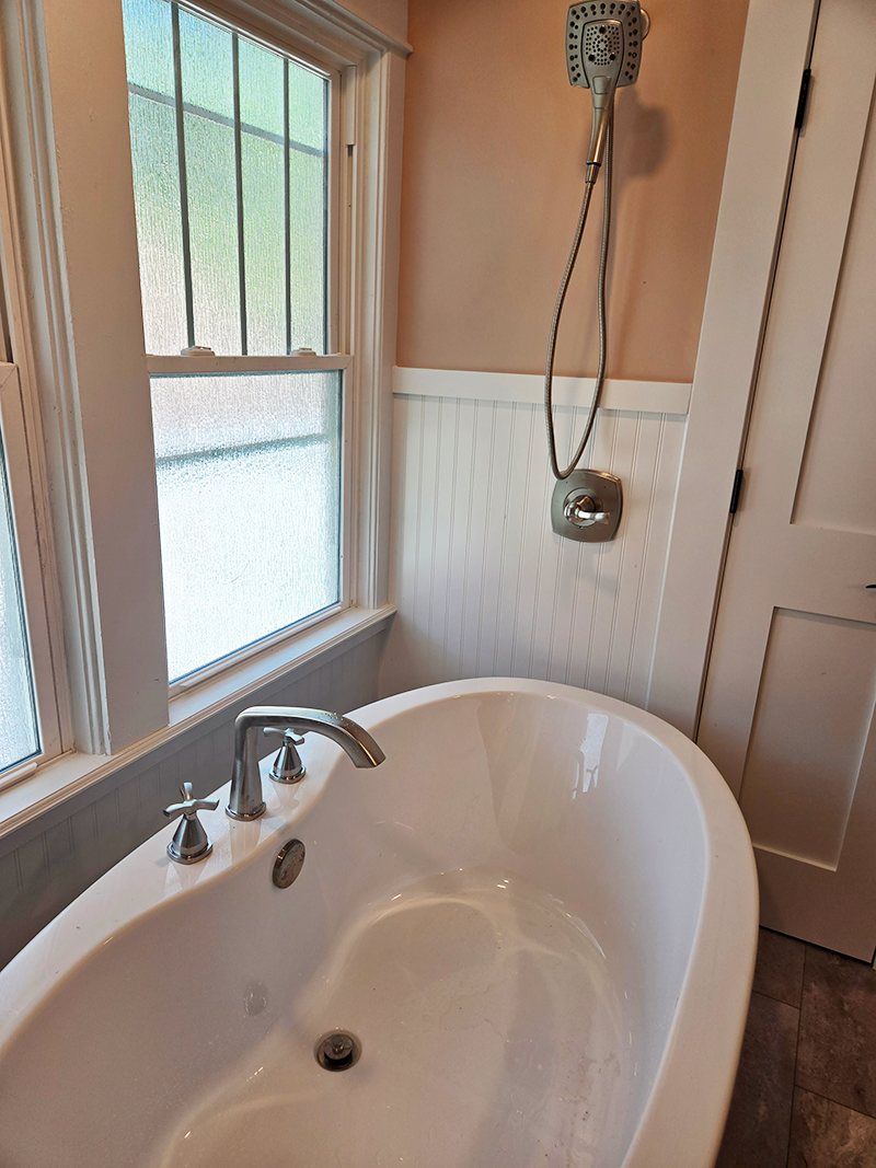 Enjoy a photo of this unique bathroom remodel project including plumbing to a unique tub and shower head in a wonderful bathroom with lots of natural light.